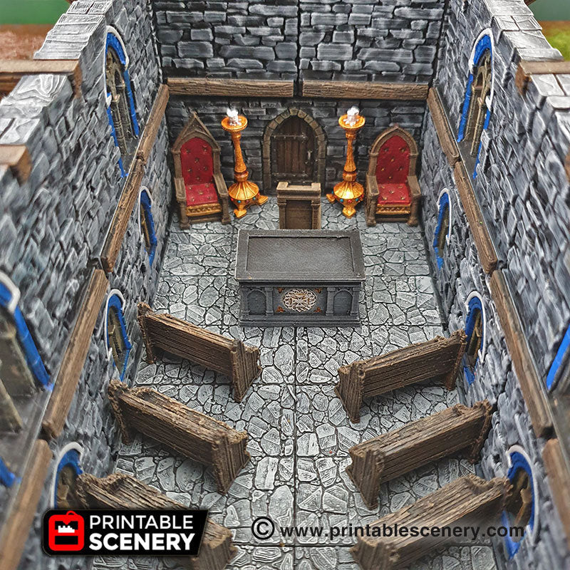 The Chapel Chattels are a great set of furniture for your fantasy tabletop and role-playing games. To get a sense of the sizes, the pews measures approximately: 0.75" x 0.32" x 0.54" in 15mm; 1" x 0.43" x 0.71" in 20mm; 1.4" x 0.6" x 1" in 28mm; 1.6" x 0.69" x 1.14" in 32mm; 2" x 0.86" x 1.43" in 40mm; and 2.7" x 1.16" x 1.93" in 54mm.