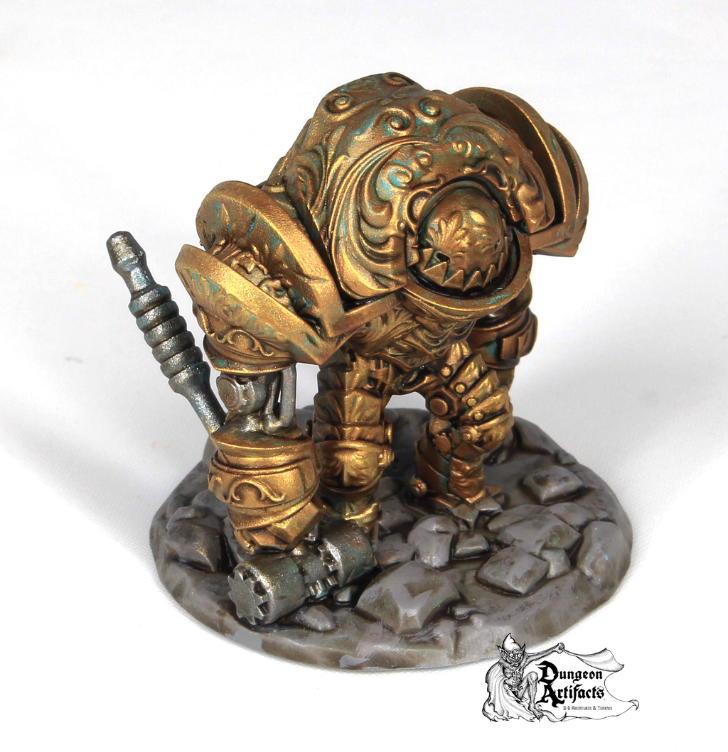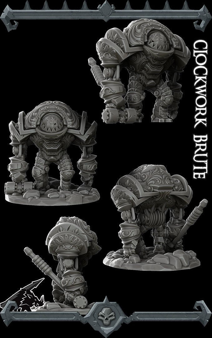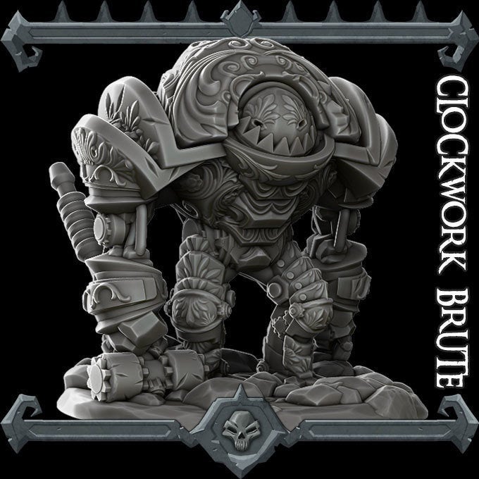 “It was not fast, but nothing could stop it from lumbering forward.” The Clockwork Brute is a detailed miniature for your tabletop role-playing and wargames. The 28mm version (with a base) is approximately 1.4" tall, the 32mm version 1.6", the 40mm is 2", and the huge version (with a 2.5"-wide base) is 2.5" tall.