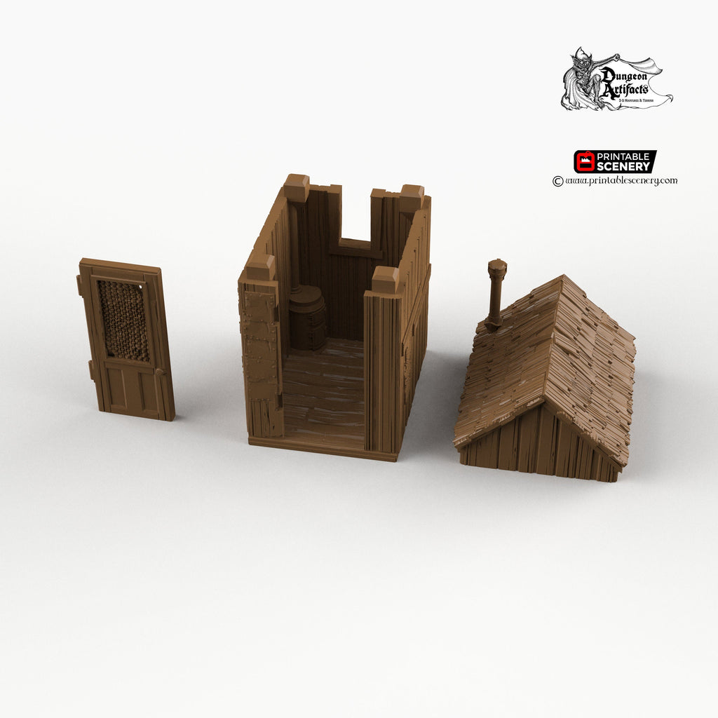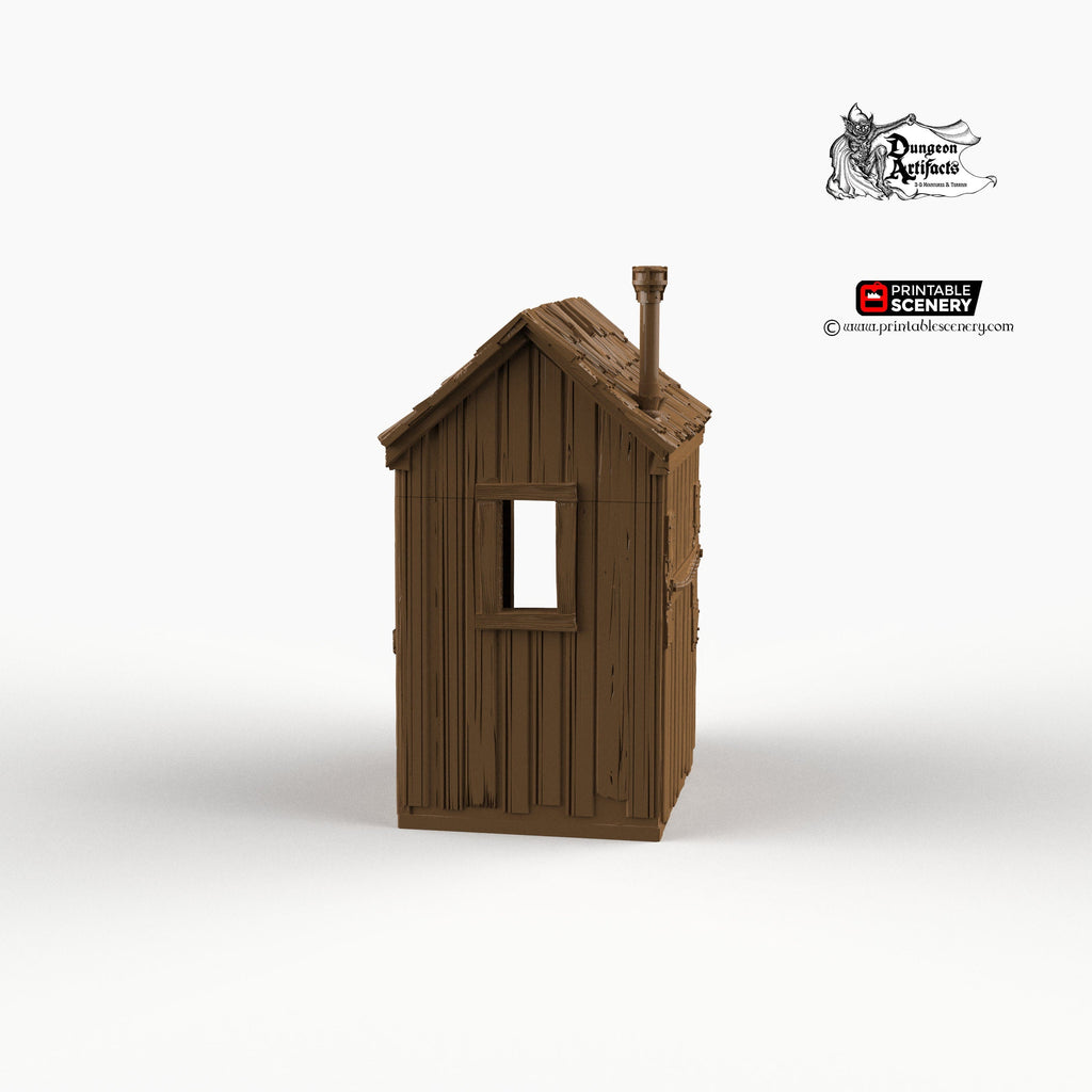 “Just a run down shack, off the side of a footpath up in the Rockies. There wasn't even enough room inside to stretch out. Still, better to wake up with muscle cramps than to wake up frozen to death.” Cooking Shed is a nice building for your western historical or fantasy tabletop and role-playing games. The building measures approximately 1.25"x1.33"x2.34" in the 28mm scale (0.75"x1"x1.25" in 15mm, and 1.33"x1.5"x2.68" in 32mm).