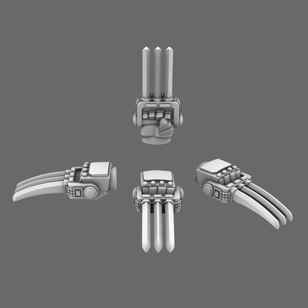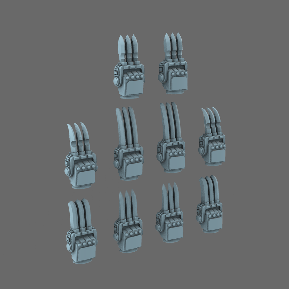 Come check out our Cyber Samurai Tekko Melee Hand Weapons. These come with intricate 3D designs that make painting a breeze. This product comes with five different tekko / melee claw weapons in both left and right hand options.This product is suitable for your favorite 28mm scale models of Grim Dark themed Superhuman Armored Warrior of Humanity like a Prime Master.