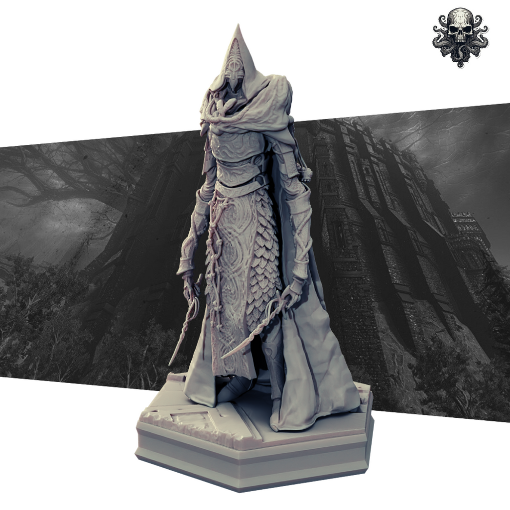 This item comes unpainted in 6 pieces. Figure comes with 2 head options. The piece is printed at an ultra-high .02mm layer height in your choice of standard tough resin or premium semi-flex. Premium has massively increased durability for table play.