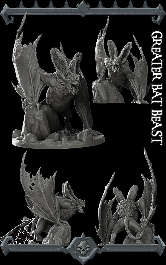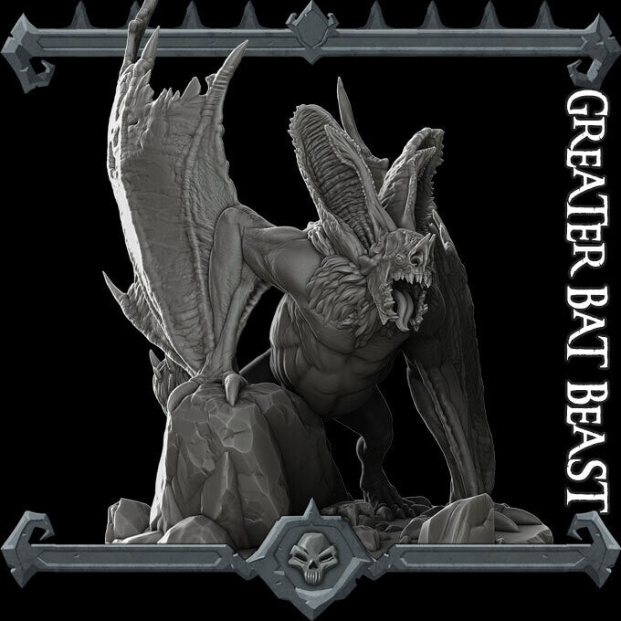 The Greater Bat Beast is a detailed miniature for your tabletop role-playing and wargames.It measures approximately: 1.00" x 1.05" x 1.46" in the Small size (with a 1” base);1.50" x 1.58" x 2.19" in Regular (1.5” base);2.00" x 2.10" x 2.92" in Large (2” base);3.00" x 3.15" x 4.38" in Huge (3” base);and 4.00" x 4.20" x 5.84 in Massive (4” base). The item comes unpainted in 1 piece. All items are printed in gray resin at an ultra-high 0.025mm resolution. As with all 3D prints, some finishing may be required.Custom print sizes and resolutions are available upon request.Items are commercially licensed from https://rocketpiggames.com/.