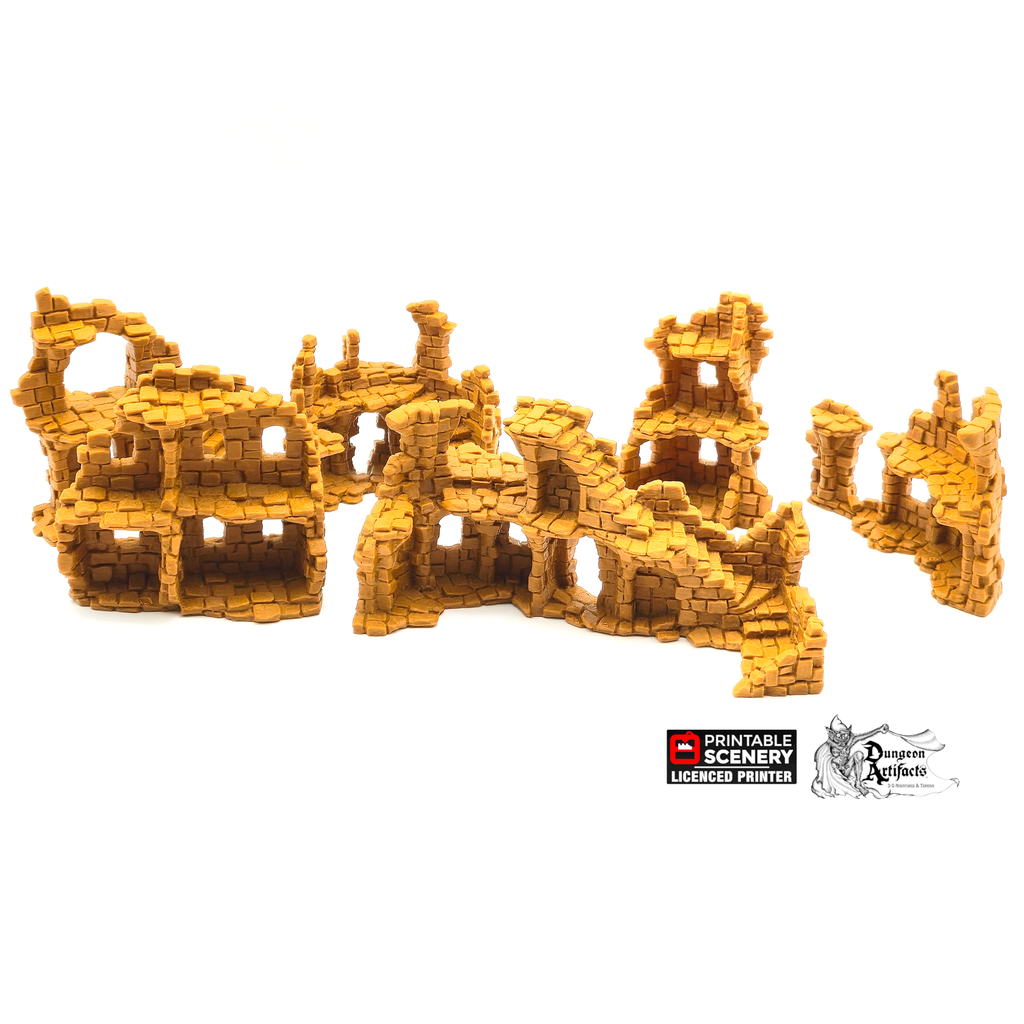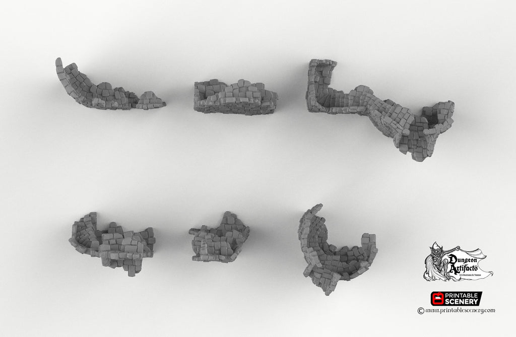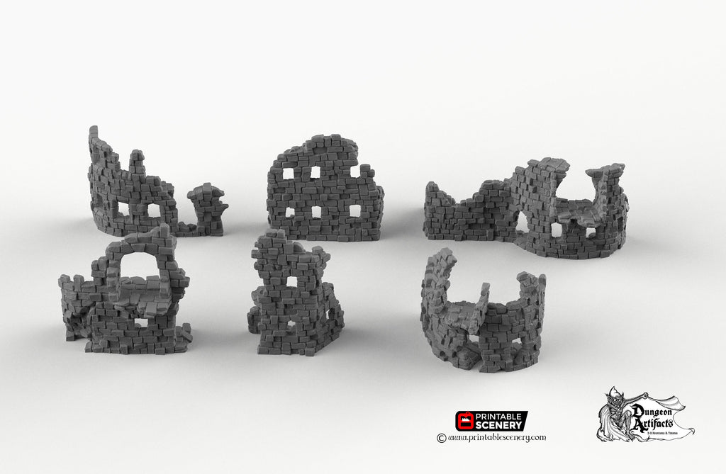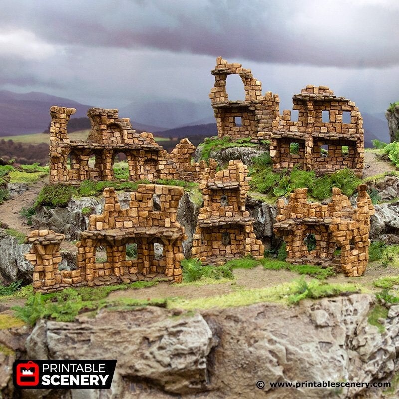“Beware of the vagabond outcasts who dwell in the ruins. If they see anyone approaching, they climb to the crumbling upper stories, and wait in ambush with bows drawn.” Hagglethorn Ancient Ruins is a great set of scatter terrain for your tabletop fantasy role-playing or wargames. Beautifully detailed, in the style of a classic stone castle wall, but with layouts that are a little more interesting and vivid than the typical perfectly-round turrets and lego-straight walls. Every piece has playable upper-story platforms, and three of the pieces have flights of stairs.