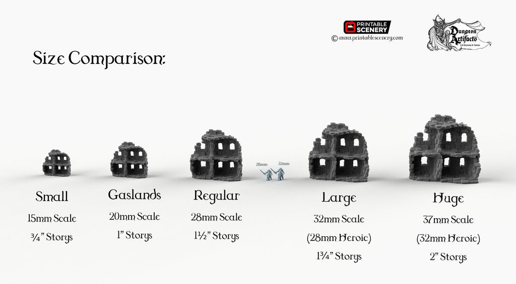 The largest piece measures approximately: 3.21" x 2.32" x 1.52" in the 10mm scale; 4.82" x 3.48" x 2.28" in 15mm; 6.43" x 4.64" x 3.03" in 20mm; 9" x 6.5" x 4.25" in 28mm; 10.29" x 7.43" x 4.86" in 32mm; 12.85" x 9.28" x 6.07" in 40mm; and 17.35" x 12.53" x 8.19" in 54mm.
