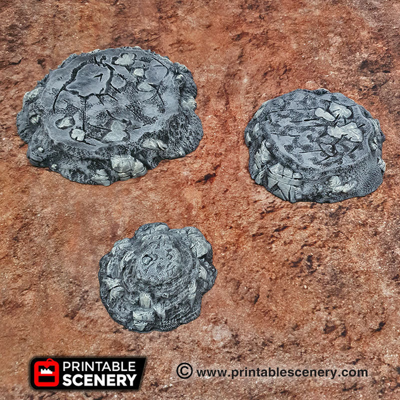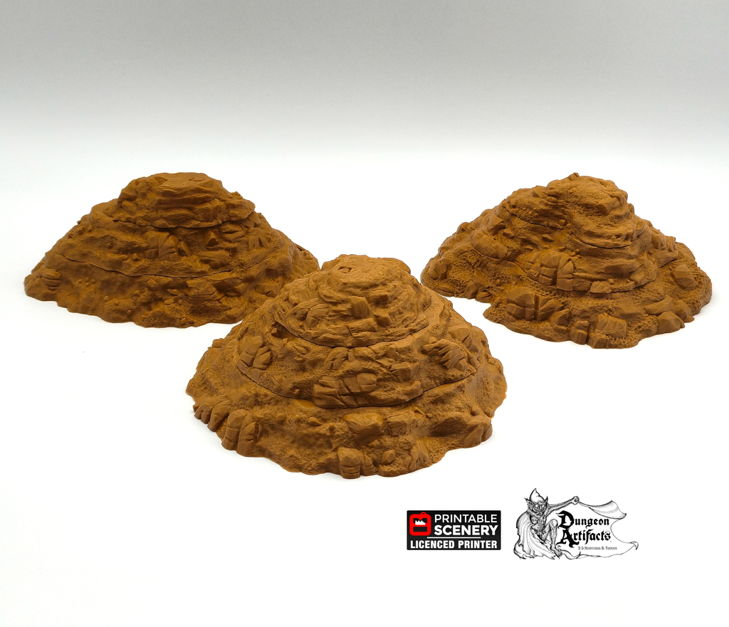 The Modular Hills are a versatile set of scatter terrain for your sci-fi or fantasy tabletop and role-playing games. The hills are modular, so the smaller pieces can be stacked upon the larger. They can also be painted a variety of ways to make the kind of terrain best-suited for your game. The largest slab measures approximately: 2.68" x 2.68" x 0.36" in the 10mm scale; 4.02" x 4.02" x 0.54" in 15mm; 5.36" x 5.36" x 0.71" in 20mm; 7.5" x 7.5" x 1" in 28mm; 8.57" x 8.57" x 1.14" in 32mm; 10.71" x 10.71" x 1.43" in 40mm.