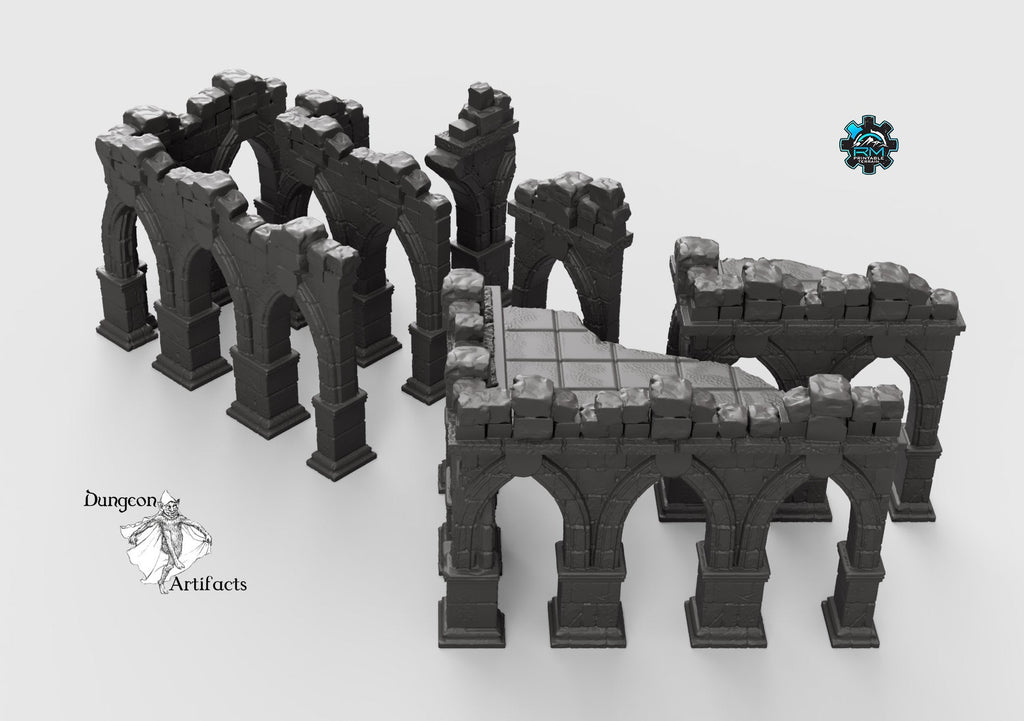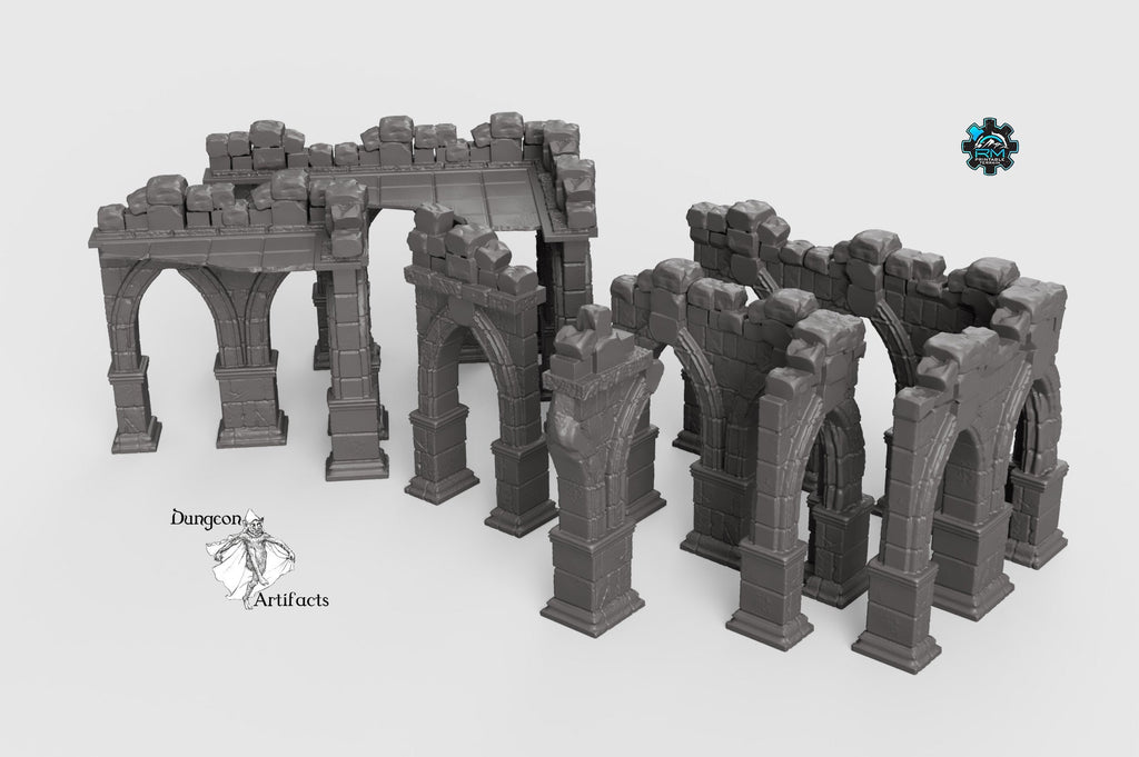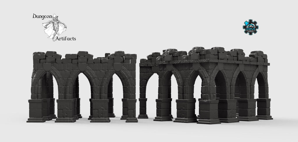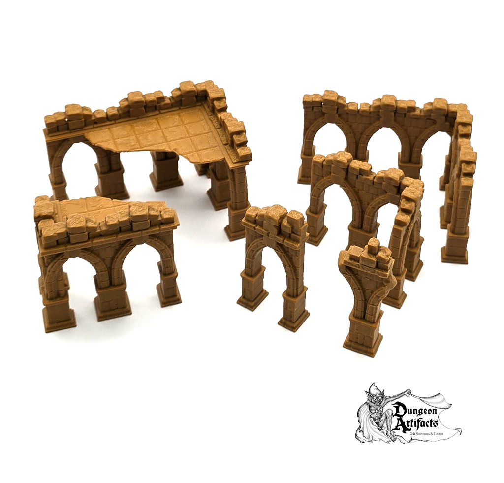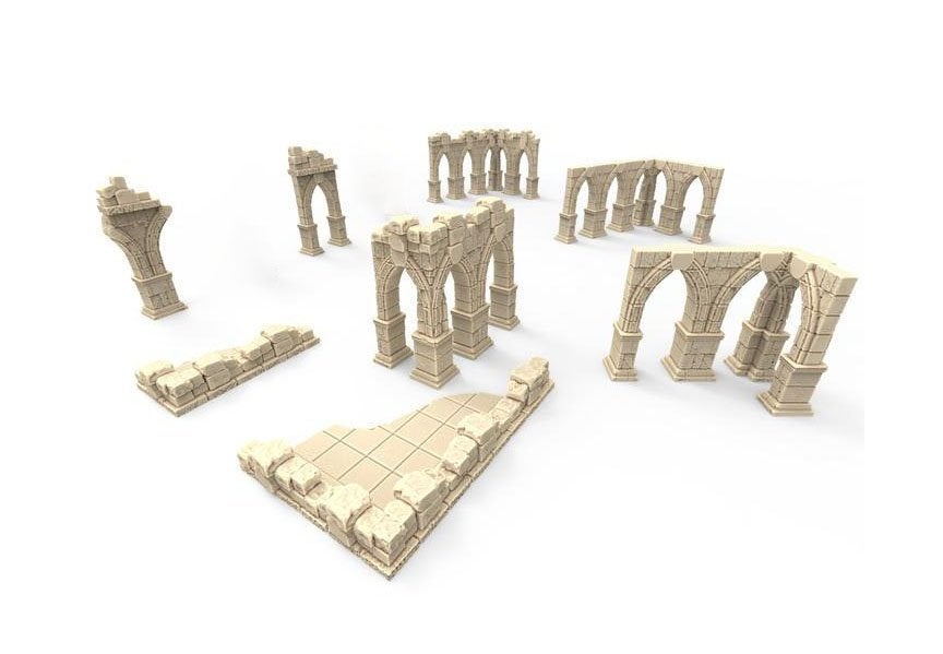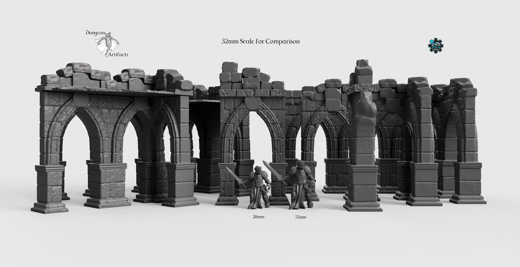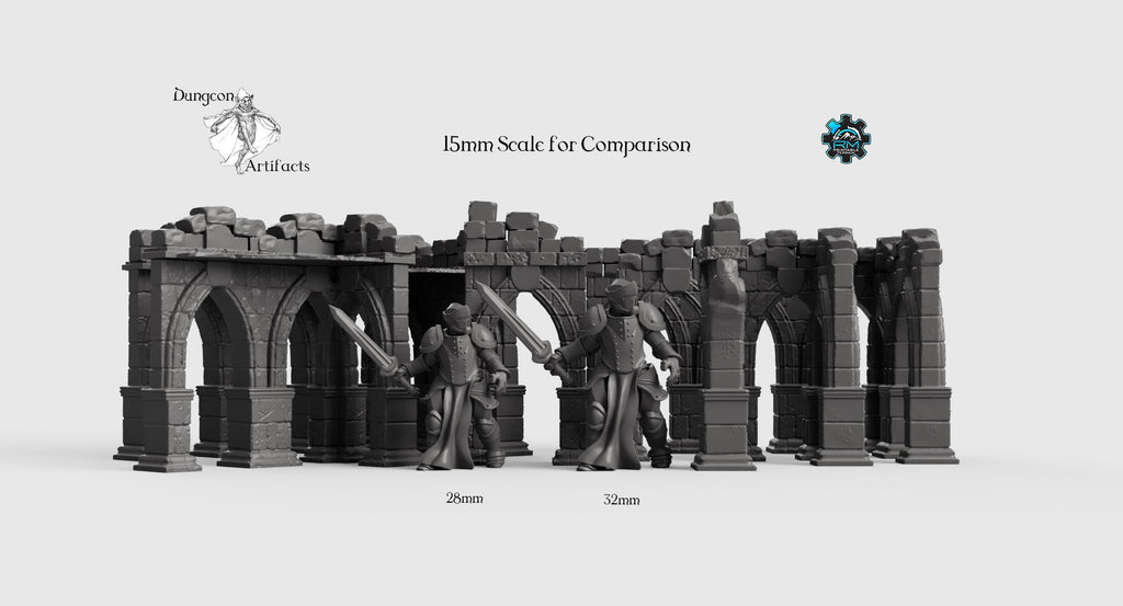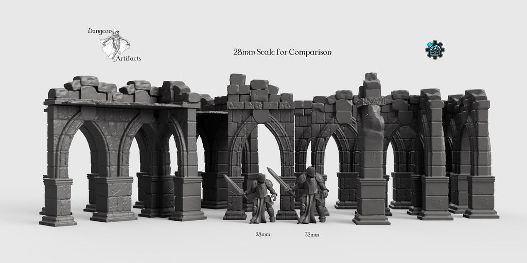 The small single archway piece measures approximately: 0.68" x 0.27" x 1.34" in the 10mm scale; 1.02" x 0.4" x 2.01" in 15mm; 1.36" x 0.54" x 2.68" in 20mm; 1.9" x 0.75" x 3.75" in 28mm; 2.17" x 0.86" x 4.29" in 32mm; 2.71" x 1.07" x 5.36" in 40mm; and 3.66" x 1.45" x 7.23" in 54mm.