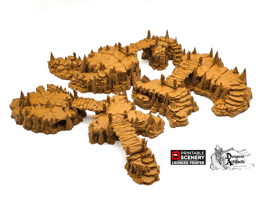 There are two versions of the Raised Caverns set: the base version with just the cavern pieces; and the + Bridges version, which includes 6 bridges.