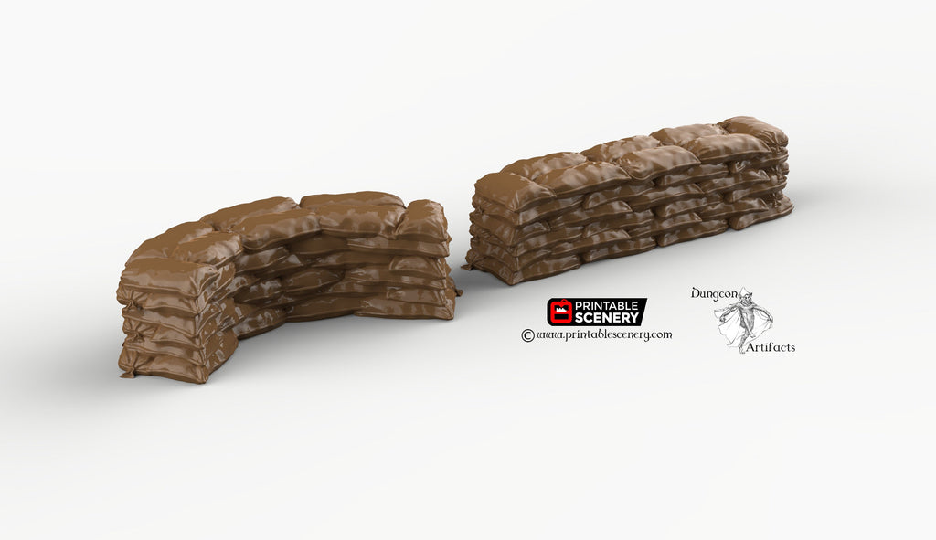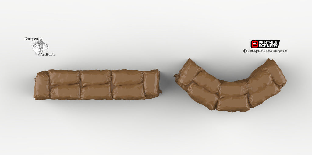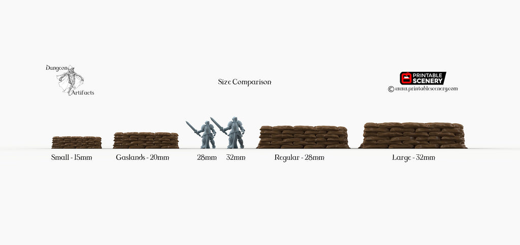 The Sand Bag Walls are a great piece for your historical, sci-fi, or fantasy tabletop and role-playing games. The straight one measures approximately: 1.43" x 0.36" x 0.36" in the 10mm scale; 2.14" x 0.54" x 0.54" in 15mm; 2.86" x 0.71" x 0.71" in 20mm; 4" x 1" x 1" in 28mm; 4.57" x 1.14" x 1.14" in 32mm; 5.71" x 1.43" x 1.43" in 40mm; and 7.71" x 1.93" x 1.93" in 54mm.
