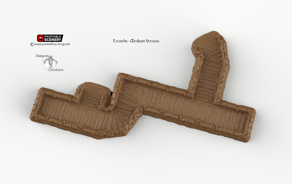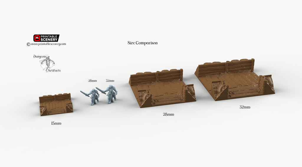 “He sat, awaiting the command to go over the top. It used to fill him with such dread, but now, after over a year of battle, his mind was a blank. He couldn't remember the last time he felt anything at all.” The Trenches are a great set of terrain for your historical and fantasy tabletop role-playing and wargames. A modular set, they can be rearranged to suit your needs. Most pieces are square and measure approximately: 0.85" x 0.85" x 0.21" in the 6mm scale; 1.43" x 1.43" x 0.36" in 10mm; 2.14" x 2.14" x 0.54" in 15mm; 2.86" x 2.86" x 0.71" in 20mm; 4" x 4" x 1" in 28mm; 4.57" x 4.57" x 1.14" in 32mm; 5.71" x 5.71" x 1.43" in 40mm; and 7.71" x 7.71" x 1.93" in 54mm.