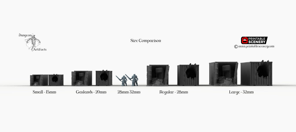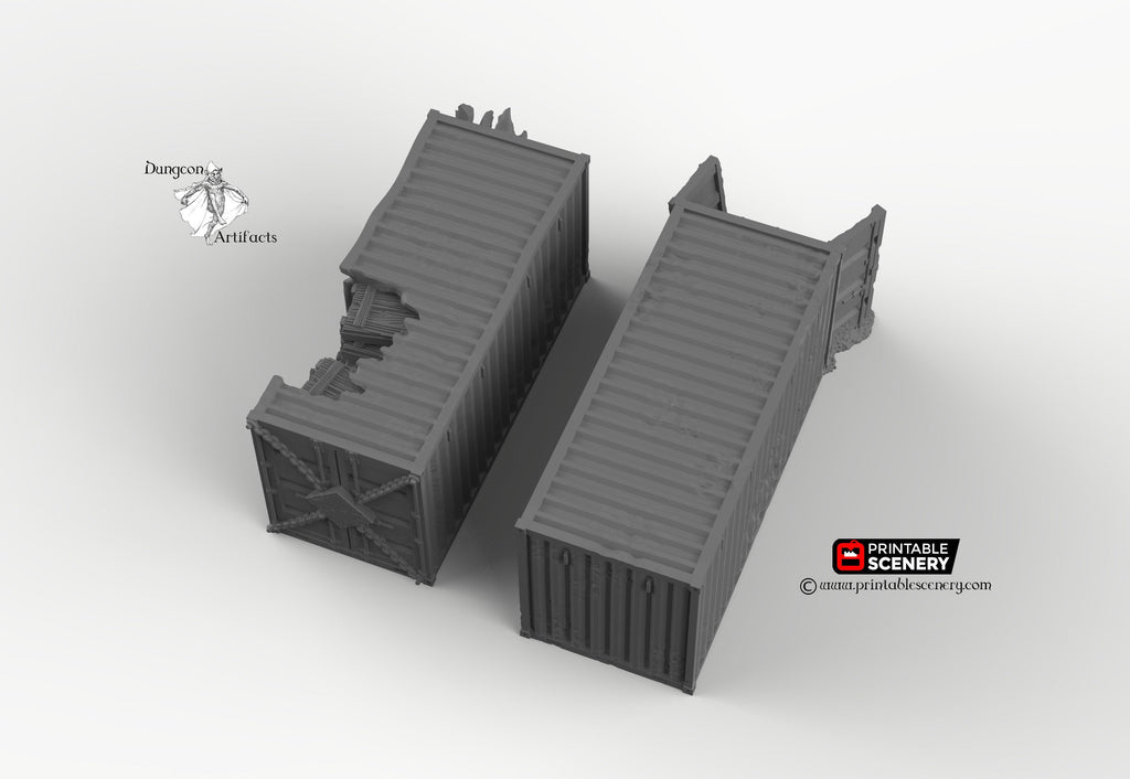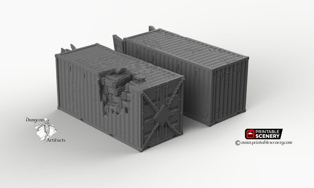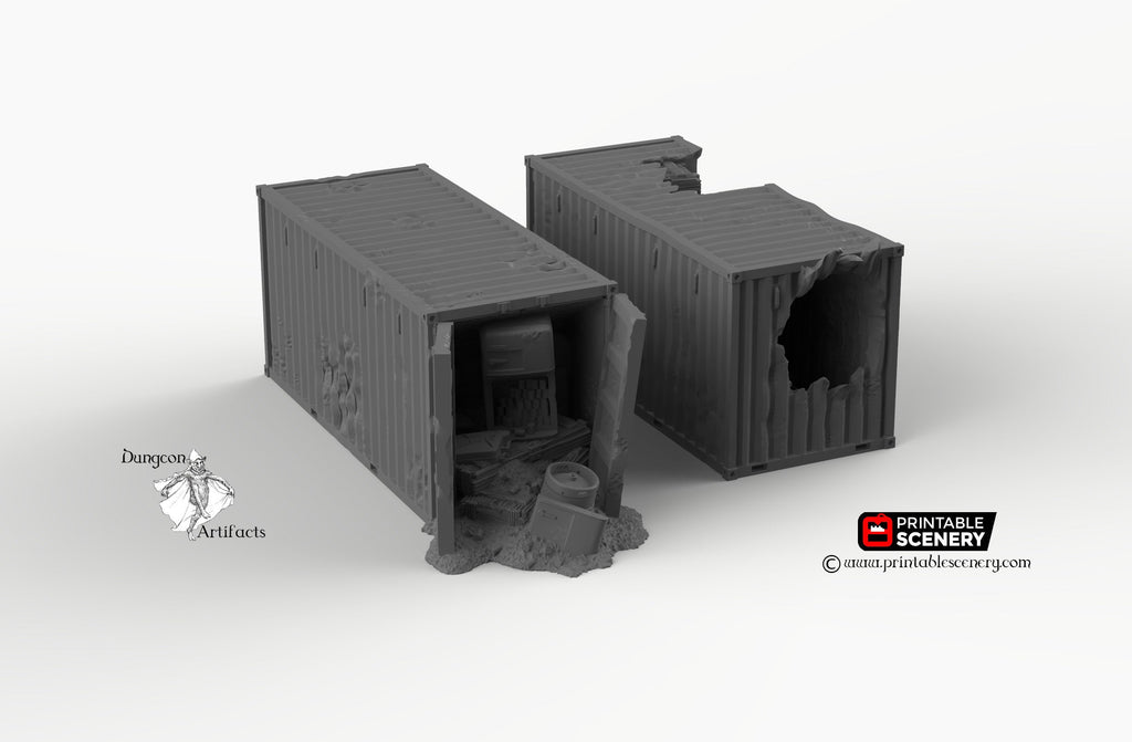 The Wasteland Shipping Containers are nice pieces for your sci-fi or fantasy tabletop and role-playing games.